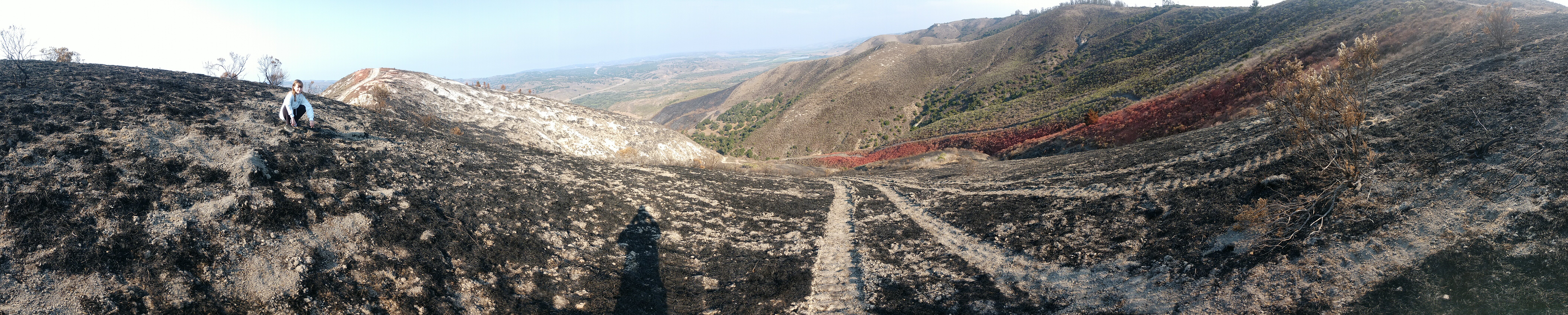 Info: Panoramic with retardant stopping burn toward Site2 and vehical tracks after burn